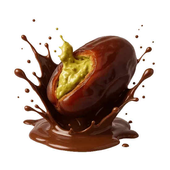 Soft, chewy dates. Smooth chocolate. Crunchy pistachio cream. A harmony of textures that delights all the senses.
